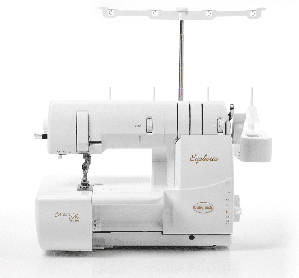 Baby Lock Euphoria levereras med dessutom knälyft. Baby Lock Euphoria har 3 nålar med flera olika söm möjligheter. Justerbar differentialmatning (förhållande från 0,6 till 2,0) Vertikalt nålnedslag för extra styrka, kontroll och stygnkvalitet. LED belysning och säkerhetssensorer (pressarfot, sido- och frontkåpa) för extra god sycomfort och säkerhet.
