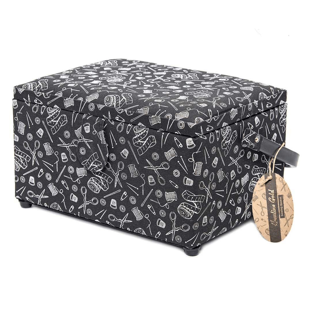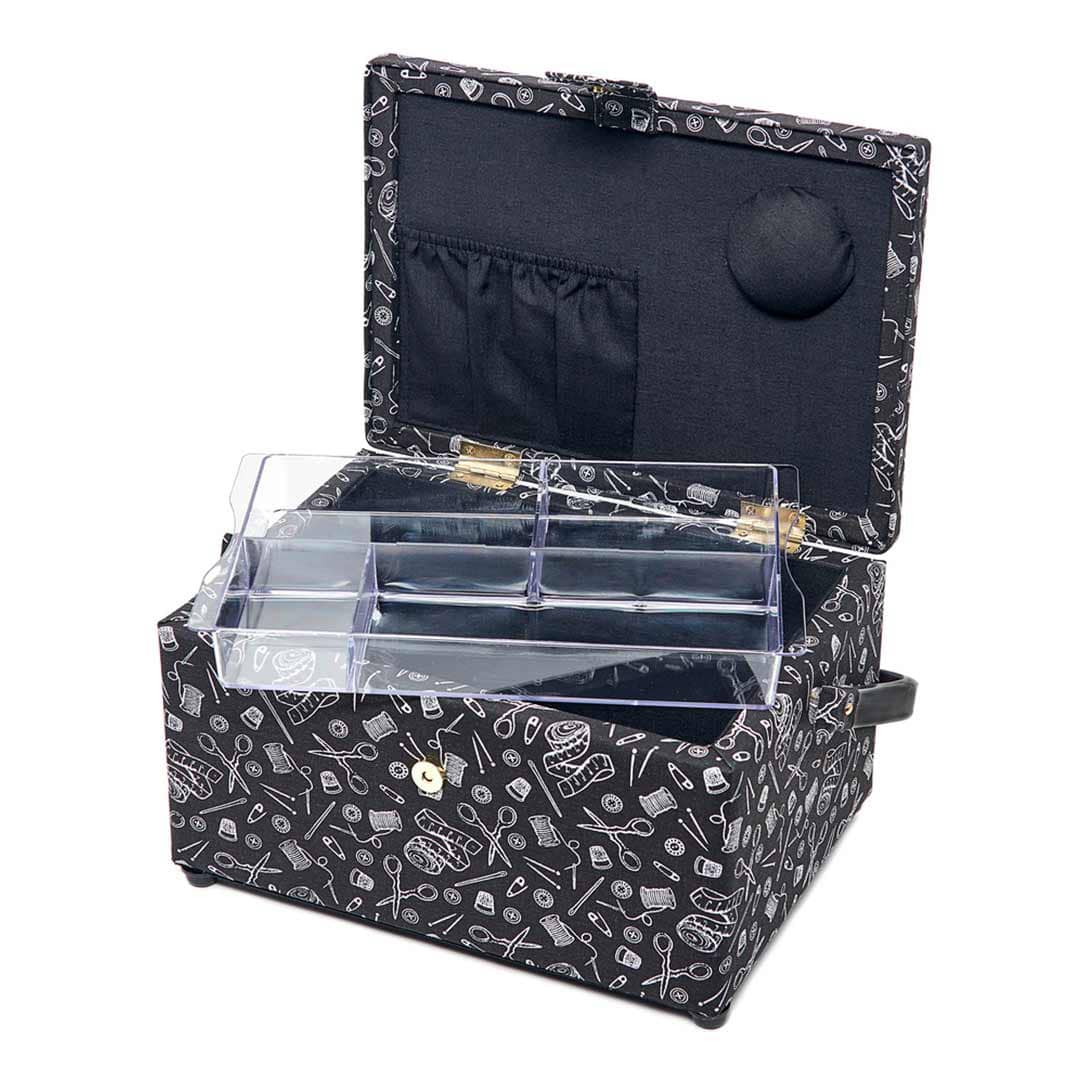 Skrinet har många lådor att förvara allt som behövs. Med en 4-sektions transparent innerlåda som går att lyfta ur och insidan av locket har en nålkudde och en elastisk förvaringsficka för att hålla tygpennor och mindre verktyg på plats.